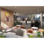 El hall principal vidriado casi en su totalidad, está vinculado con el jardín frontal, el bike parking y con los jardines internos, generando un ambiente muy bien iluminado, rodeado de vegetación. También cuenta con un área de cowork.